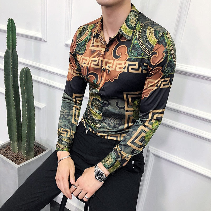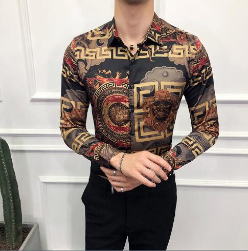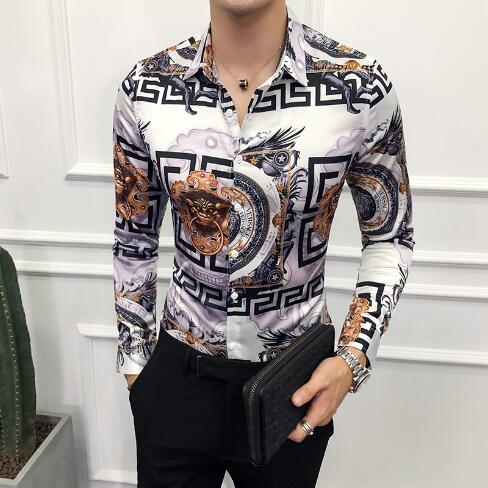 Fashion tuxedo shirt 2019 mens dress shirts gold slim long sleeve shirt for male white Baroque social shirt Casual floral shirt